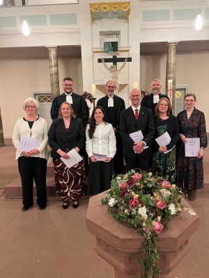 Beerfelden. Sechs neue Prädikantinnen und Prädikanten wurden im Rahmen eines Gottesdienstes in der evangelischen Martinskirche in Beerfelden offiziell mit ihrem Dienst beauftragt und für ihren weiteren Weg gesegnet. Sie werden künftig ehrenamtlich eigenständig Gottesdienste gestalten, eigene Predigten verfassen und so das Wort Gottes verkündigen; ebenso können sie taufen und mit der Gemeinde das Abendmahl feiern. "Wenn Menschen von Gott erfahren sollen, muss es andere geben, die von ihm erzählen und die seine Botschaft weitertragen", wandte sich Dekan Carsten Stein an die neu Beauftragten: Katrin Beisel (Beerfelden; Mentorin: Pfarrerin Xenia Mai, Mossautal), Anne Hechler (Zell; Mentor: Pfarrer Martin Hecker, Bad König), Nina Jährling (Brensbach/Kirchbrombach; Mentorin: Pfarrerin Christina Meyer, Breuberg), Patricia Rostasi (Erbach; Mentorin: Pfarrerin Kerstin Peiper, Steinbach), Sandra Suhm (Neckarsteinach; Mentor: Pfarrer Alexander Muth, Hirschhorn) und Dr. Michael Trumpfheller (Michelstadt; Mentorin: Pfarrerin Dr. Anneke Peereboom, Michelstadt). - Tamas Hofferbert (Bad König; Mentor: Pfarrer Roger Frohmuth, Beerfelden) konnte aus gesundheitlichen Gründen nicht dabeisein.